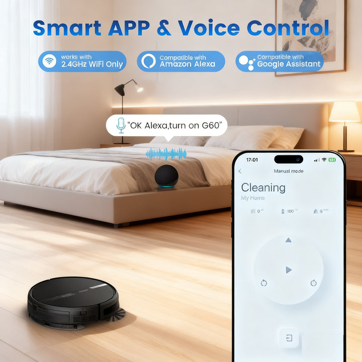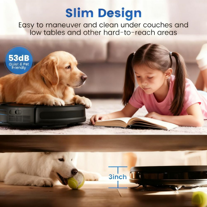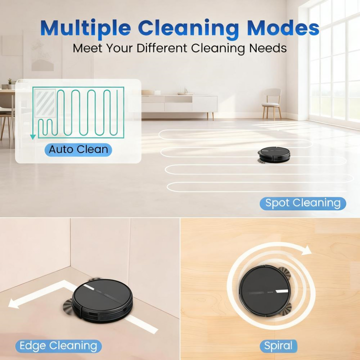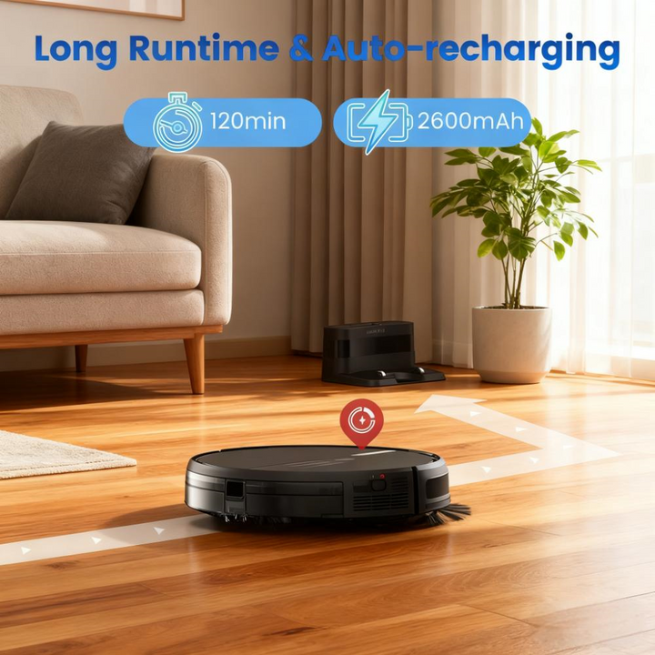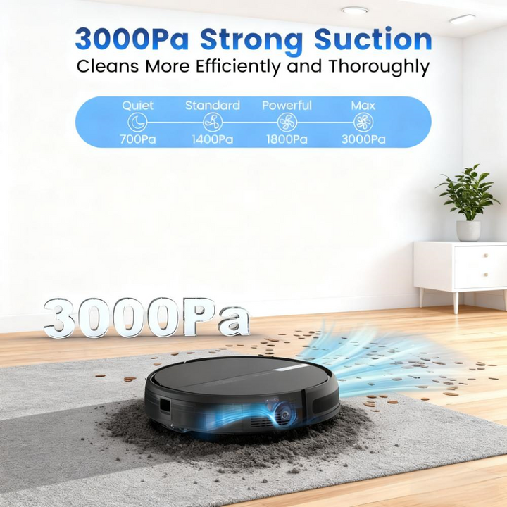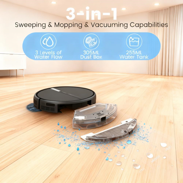 This 3-in-1 robot vacuum-mop combo streamlines cleaning with sweeping, mopping, and vacuuming in one session. It features a 2-in-1 dustbin (305ml dust box + 255ml water tank) for hassle-free emptying. With 3000Pa strong suction, it tackles debris, pet hair, and food scraps on hard floors and low-pile carpets. Choose from 4 adjustable suction levels—Quiet (700Pa), Standard (1400Pa), Powerful (1800Pa), or Max (3000Pa)—to match your needs. Works with a Wi-Fi smart app and voice commands (compatible with Alexa/Google Assistant) for hands-free control. Intelligent gyroscope navigation powers 4 clean modes: Auto, Spot, Edge, and Spiral. Enjoy 120-minute runtime with auto-recharge, low noise, a 3-inch slim design for tight spaces, plus smart obstacle avoidance, fall prevention, and 20mm obstacle crossing.